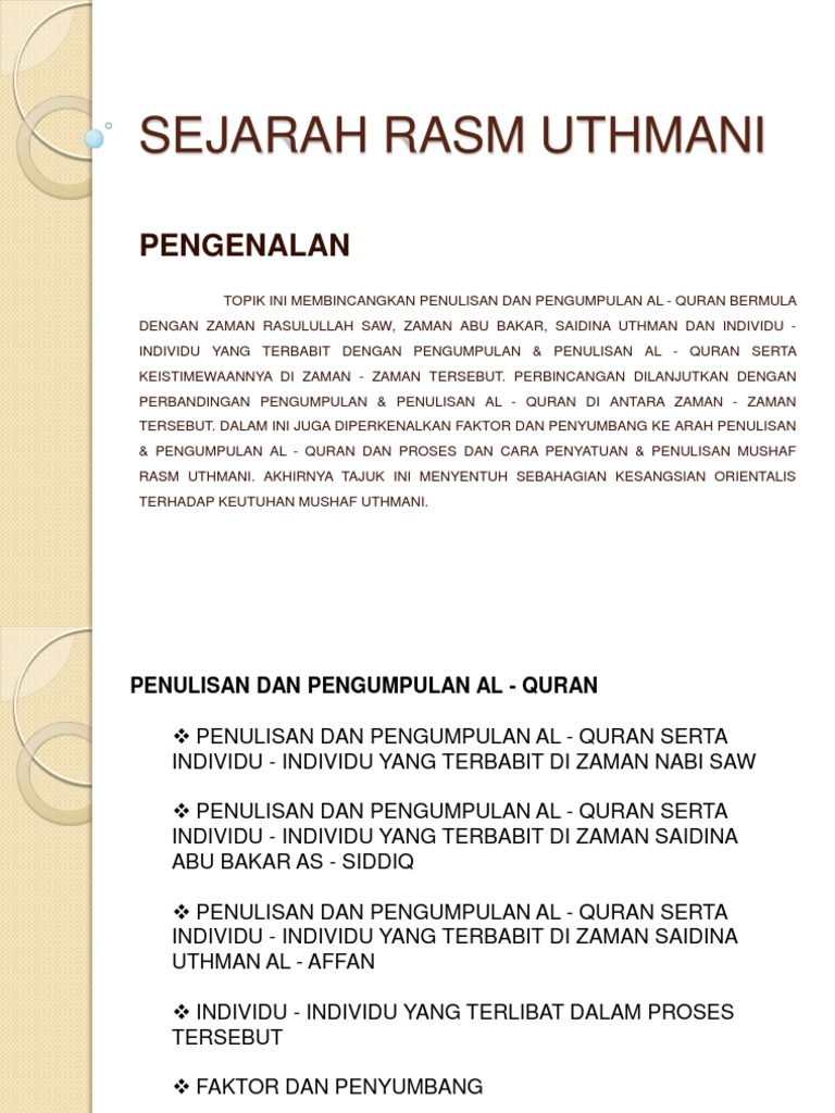 Ketika orang-orang Sham dan Iraq bersatu dalam sebuah peperangan untuk menaklukkan Arminya. Rasm dari segi bahasa bermaksud kesan atau bekas. SEJARAH DAN KONSEP RASM UTHMANI Menurut ahli sejarah penulisan al Quran bermula dari zaman Nabi Muhammad saw di mana sebaik sahaja Rasulullah menerima wahyu.