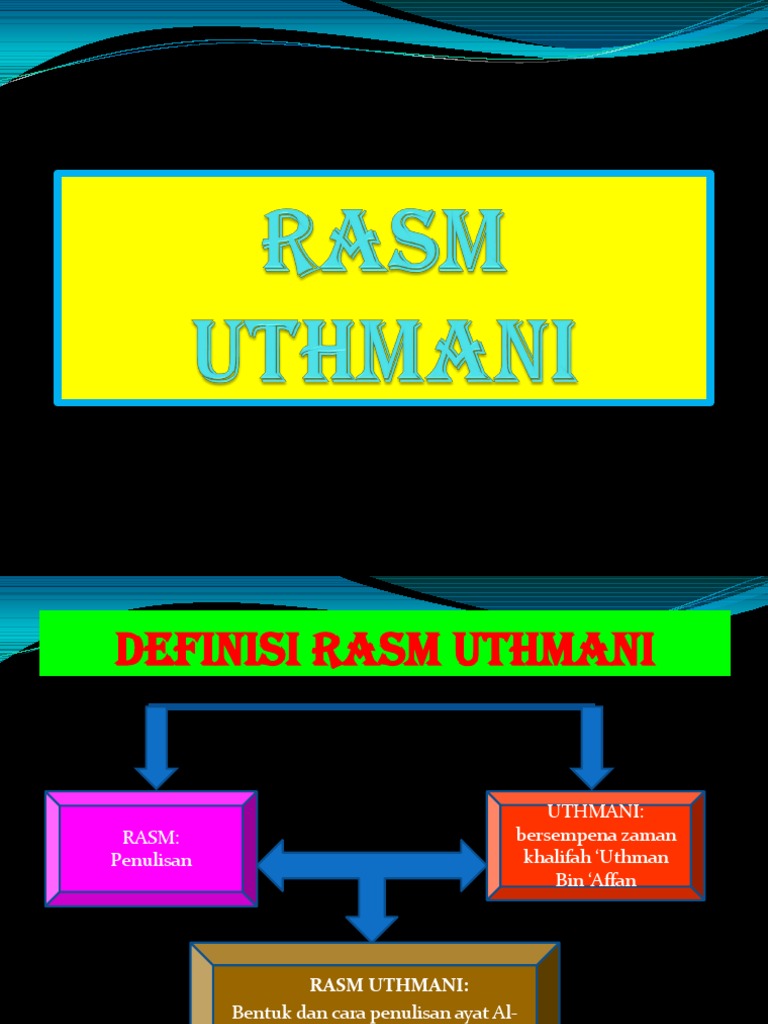 Rasm bermaksud pembentukan kalimah melalui penggabungan huruf hijaiyah. Mushaf Al-Quran baru sempurna dibukukan pada zaman Sayyididina Utsman Bin Affan radhiyallahu anhu. SEJARAH DAN KONSEP RASM UTHMANI.